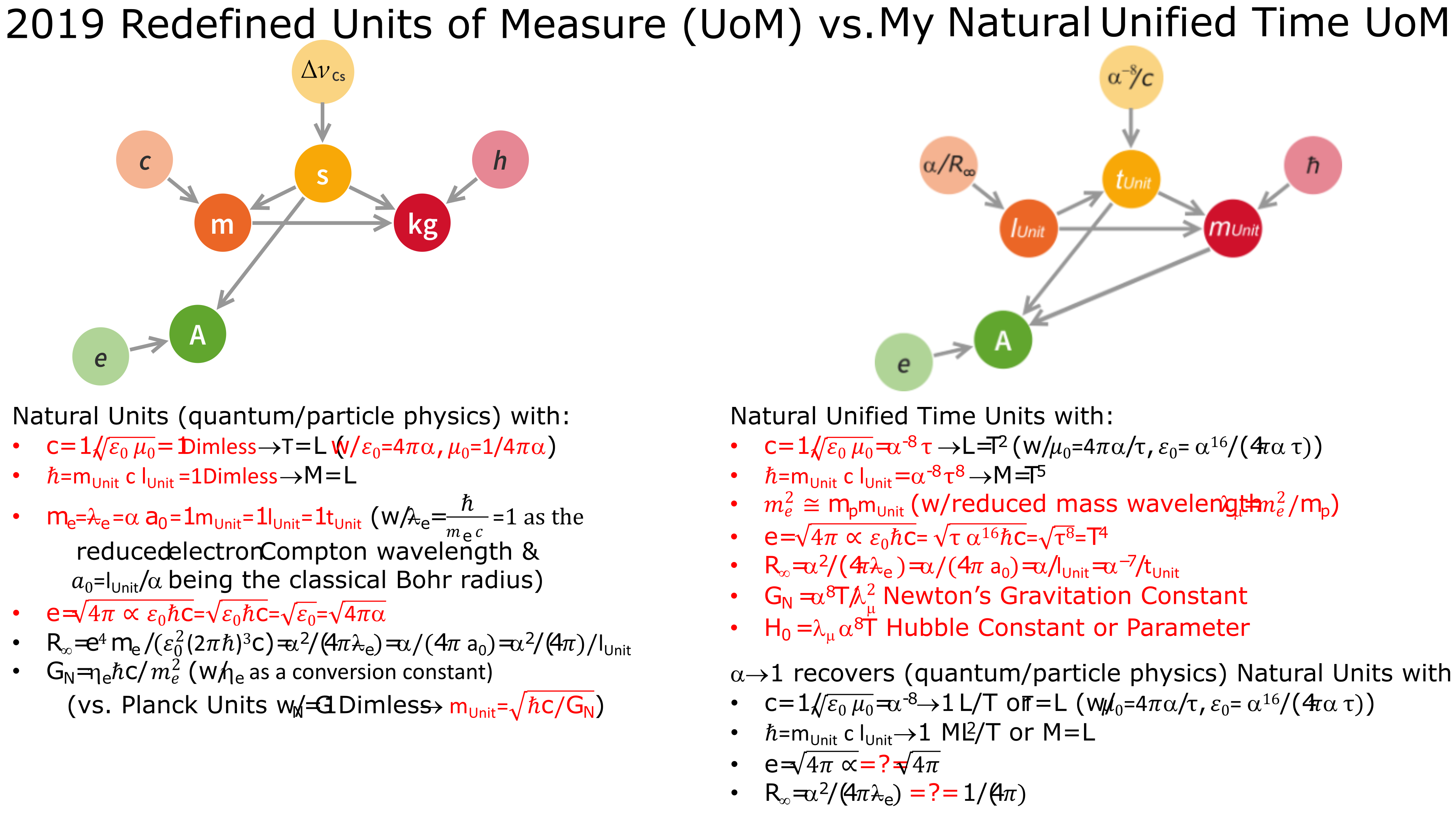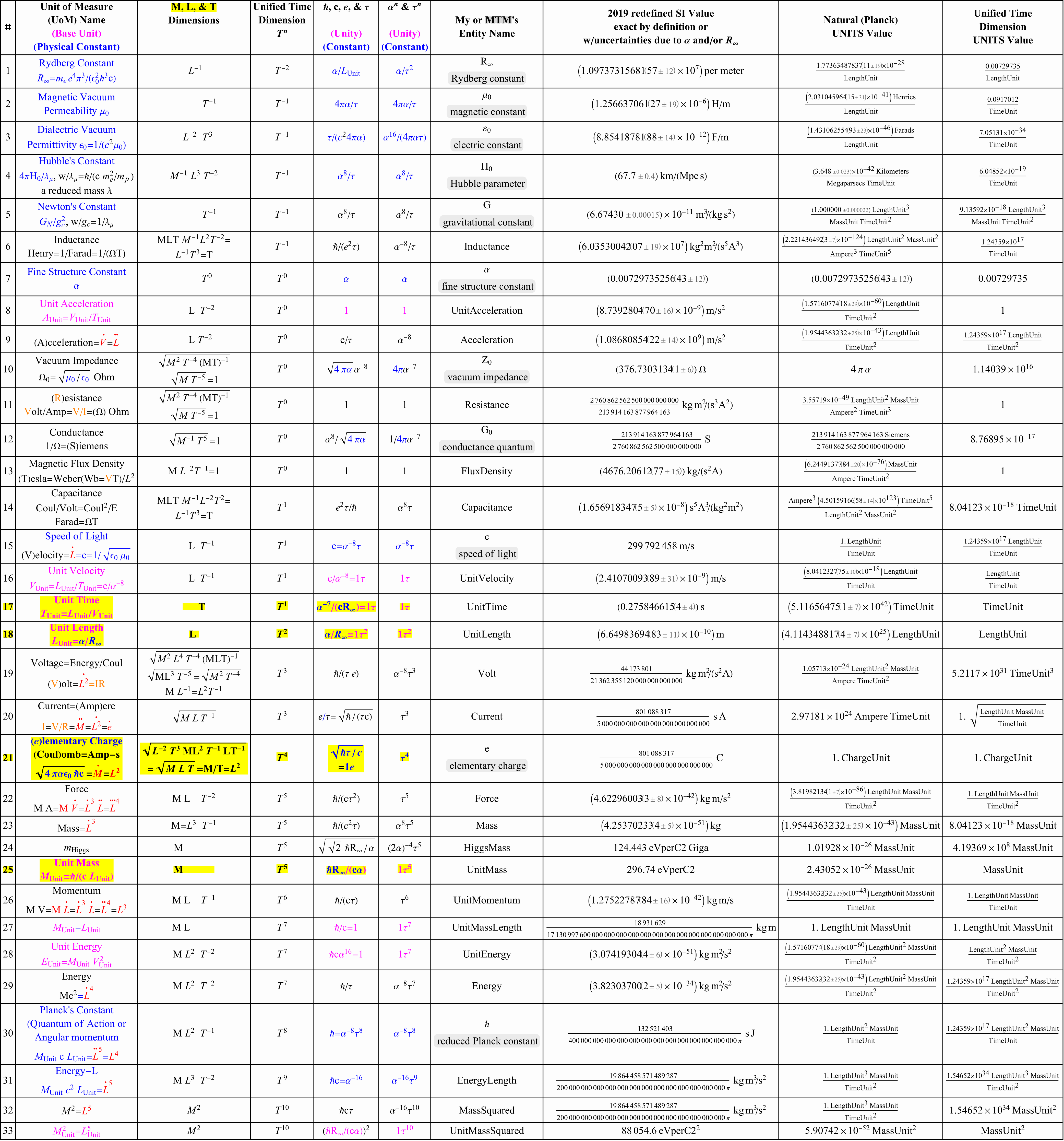 See below a list of the constants and UoM elements for SI, Natural (Planck or geometrized) units, and my own “more Natural” Time Unified UoM, which includes the Higgs mass (a posteriori) postdiction. The list is sorted by n where (Tn) is the unified (reduced) time dimension of the physical constant or UoM.