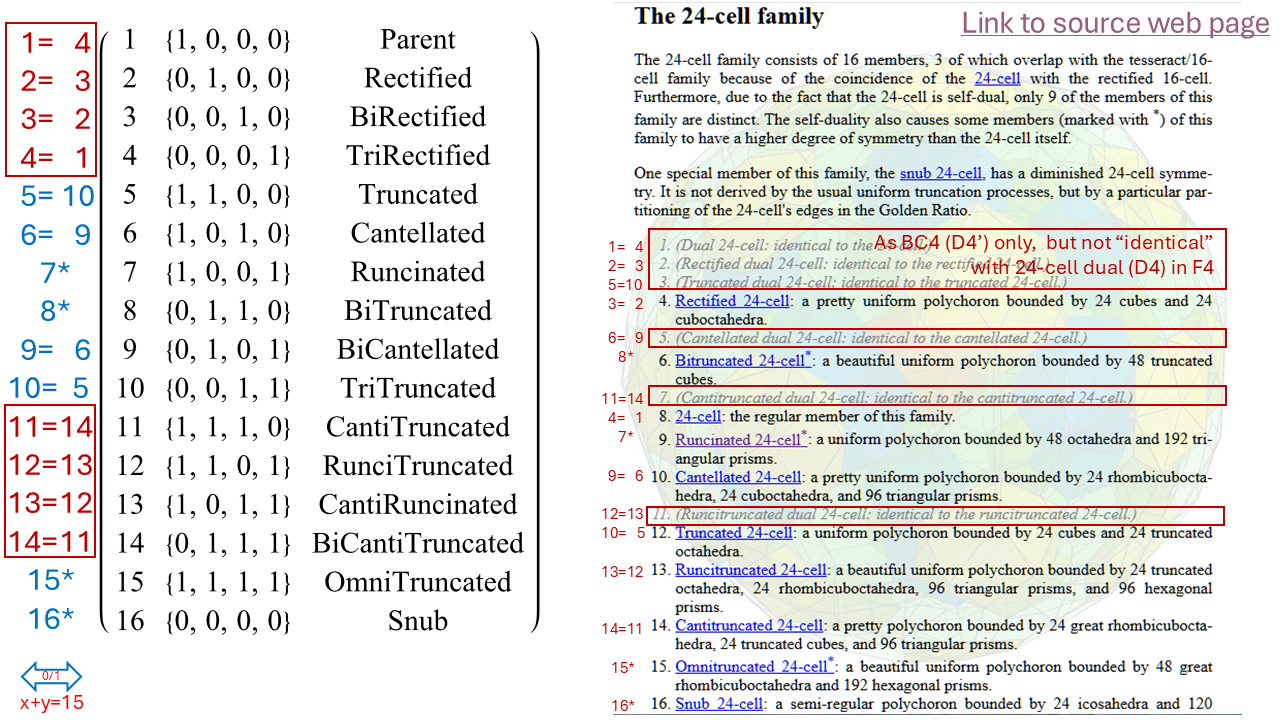 I took screenshots of a few qfbox.info pages to annotate the differences in layout below. Please note the palindromic binary Weyl group orbits and operation equivalences between them: