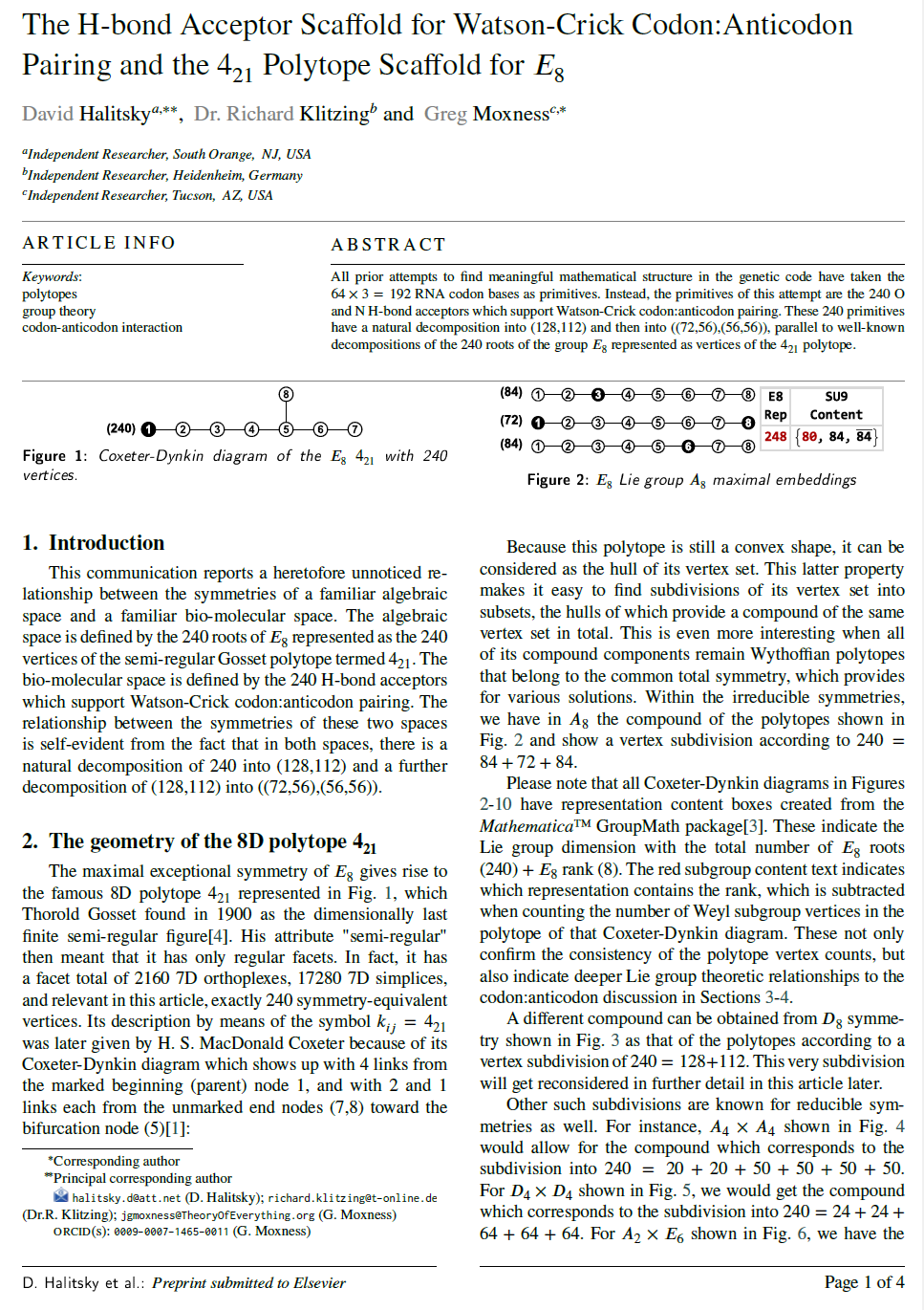 My latest ToE paper here. This paper presents compelling E8 group-theoretic properties that are found in the set of 240 O and N H-bond acceptors which support Watson-Crick codon:anticodon pairing. Empirically correct consequences are deduced from the group-theoretic model.