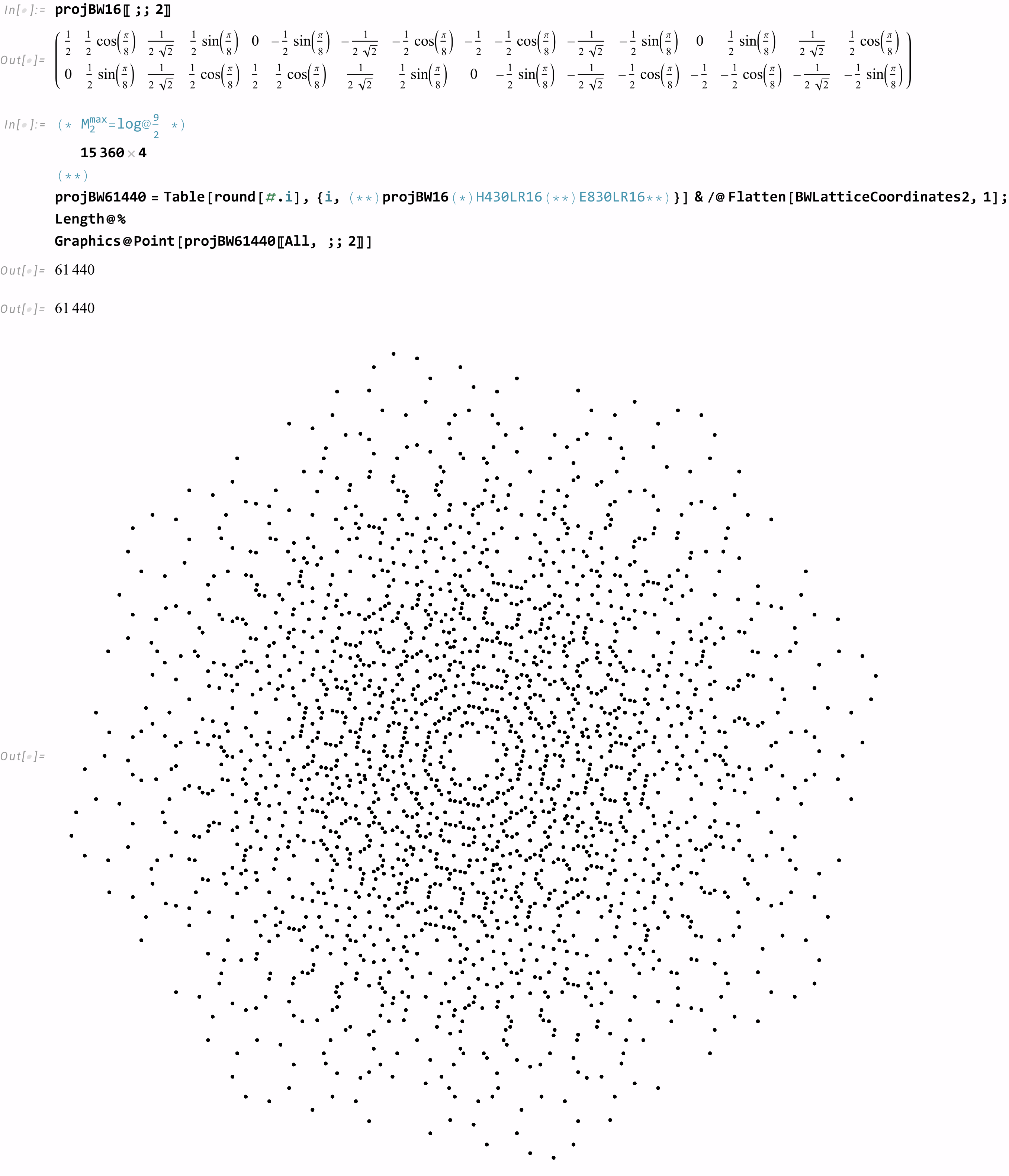 It is interesting to note that if one projects the 61440 2nd shortest 16D vectors of BW16 using orthogonal projection mapping ℝ¹⁶ → ℝ² (i.e. to B8 basis vectors), we get a similar result as projecting the 2nd shortest 8D vectors of E8 using the same basis: